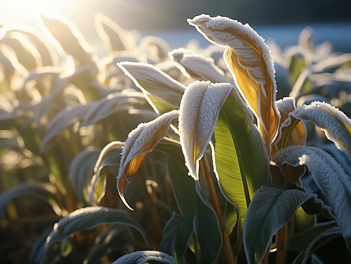 Pour des variétés telles que Musa ‘Dwarf Orinoco’ ou Musa ‘Red Tiger’, qui sont moins résistantes, une stratégie de récupération active est cruciale. Si la plante est en pot, ramenez-la à l’intérieur ou dans un espace où la température est stable et hors gel. Si elle est en pleine terre, couvrez le sol avec un paillis organique pour maintenir la chaleur. Gardez un œil sur l’évolution de la plante et ajustez vos soins en conséquence. Une fertilisation douce peut être reprise une fois que la croissance reprend au printemps.